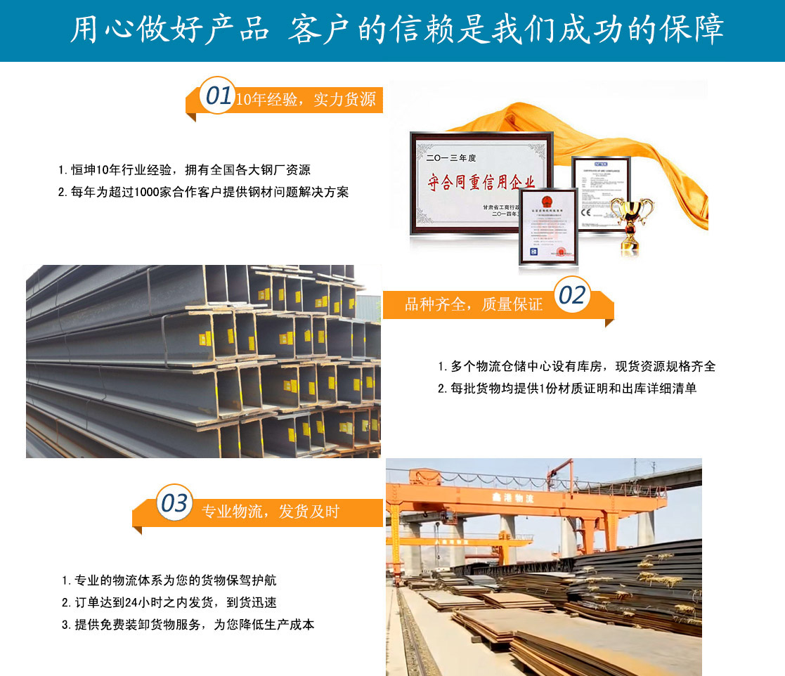 蘭州恒坤商貿有限公司立足于鋼材貿易,主要經營:鋼板、角鋼、工字鋼、槽鋼、H型鋼、鍍鋅槽鋼、鍍鋅角鋼、鍍鋅板、鍍鋅卷、鍍鋅圓鋼、鍍鋅工字鋼多種型號鋼材產品。多年來,我公司始終堅持質量第一,信譽至上的經營方針,與酒鋼、包鋼、八鋼、唐鋼、鞍鋼、萊鋼、兗礦、日照鋼鐵、濟鋼,成都、天津等多家企業達成大批量物資供應協議,并且與省內外多家客戶建立了合作關系。